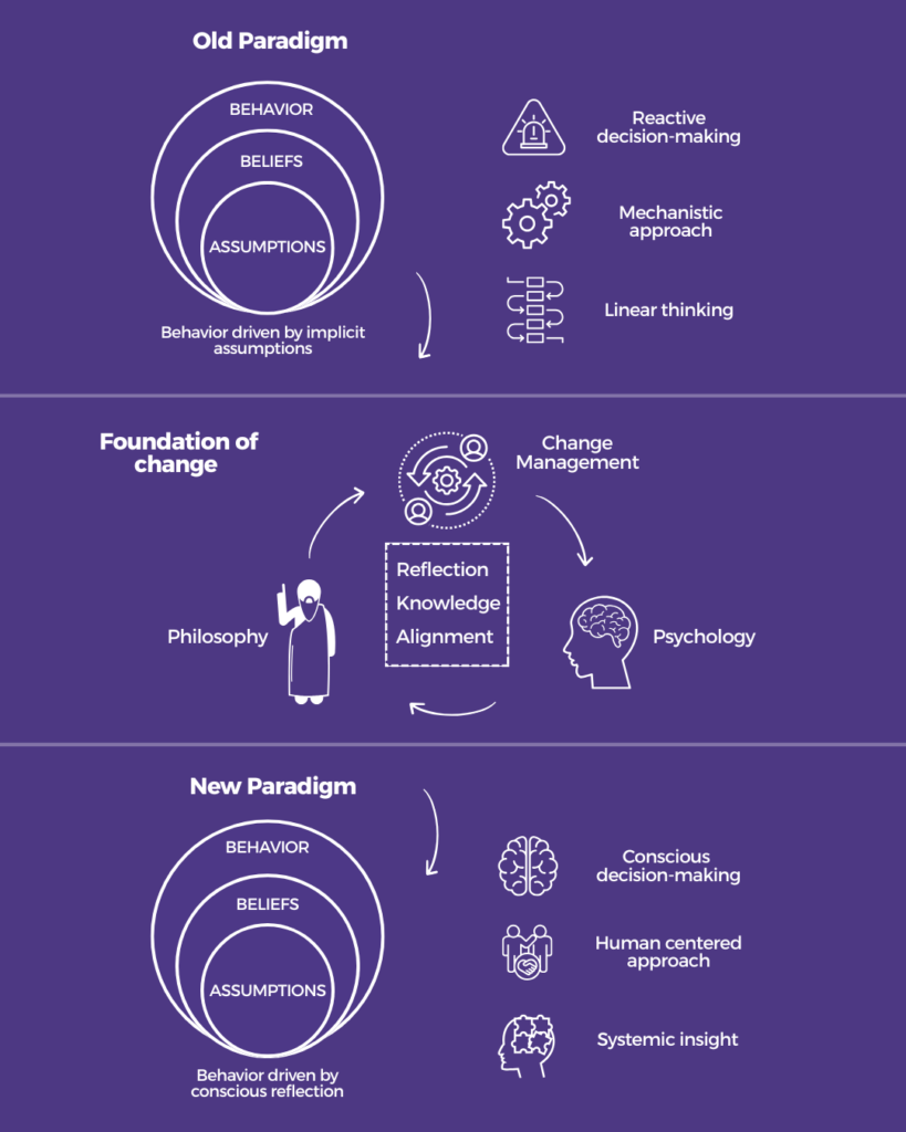 A paradigm is a framework that shapes how we perceive the world and act within it. It encompasses our assumptions, beliefs, and the methods we use to solve problems. Meaningful transformation requires insight into the deeper psychological and philosophical layers that influence behavior. By integrating change management, psychology, and philosophy, organizations can achieve a paradigm change that is not only strategic but also deeply human.